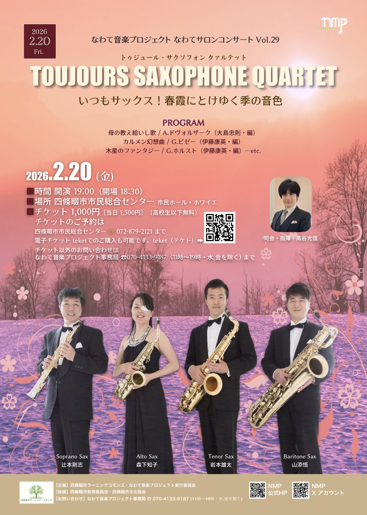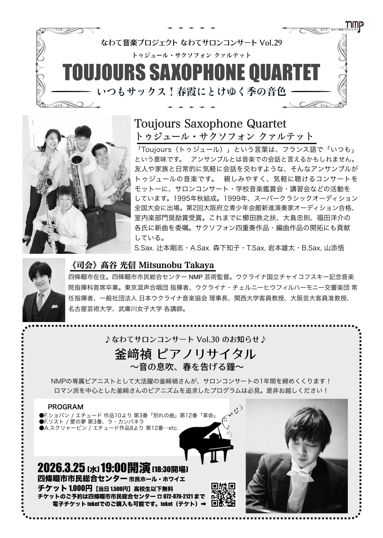 2025年10月23日 / 最終更新日時 : 2025年10月23日 SugimotoShiho サロン – vol. 29 なわてサロンコンサート TOUJOURS SAXOPHONE QUARTET いつもサックス!春霞にとけゆく季の音色 2026年2月20日(金) 19:00開演(18:30開場) 於 四條畷市市民総合センター市民ホール・ホワイエ 演者:辻本剛志(Soprano Sax)・森下知子(Alto Sax)・岩本雄太(Tenor Sax)・山添悟(Baritone Sax) 司会:髙谷光信(指揮者,NMP音楽監督) チケット1,000円(当日1,500円)のご購入は四條畷市市民総合センター(℡ 072 879 2121),またはteket(電子チケット)から。 チラシ表ダウンロード チラシ裏ダウンロード Follow me! @NMPsince2022 FacebookXBlueskyHatenaCopy