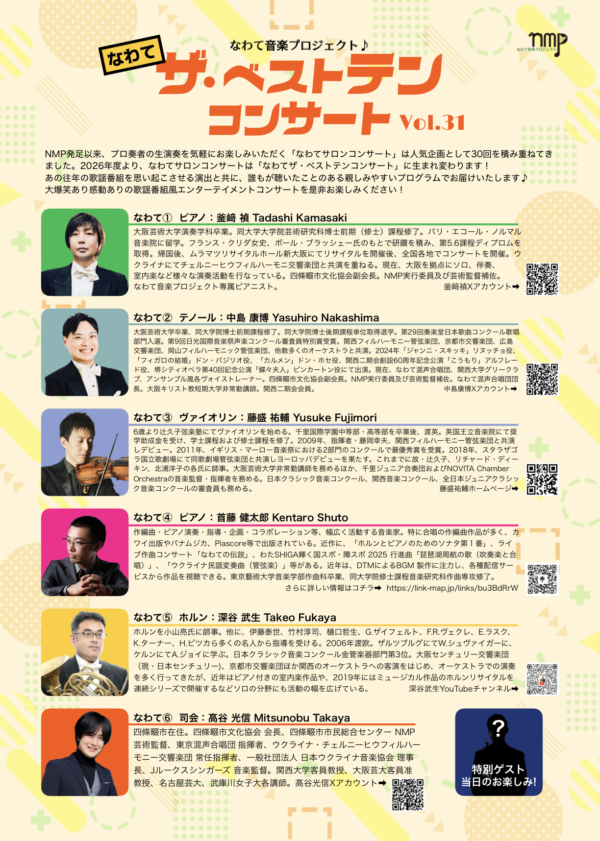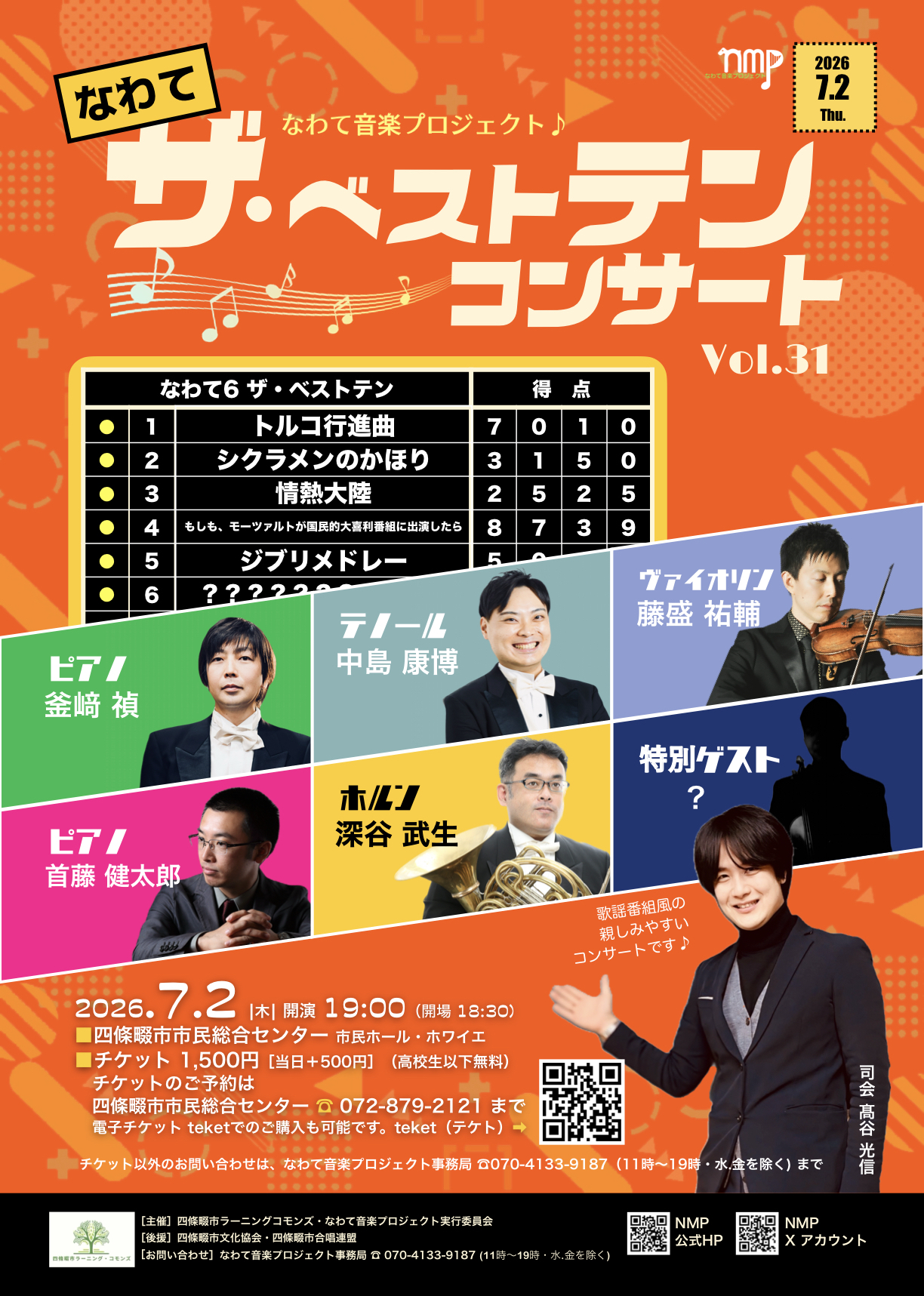 2026年4月25日 / 最終更新日時 : 2026年4月25日 SugimotoShiho サロン なわて音楽プロジェクト なわてザ・ベストテンコンサート Vol.31 歌謡番組風の親しみやすいコンサート♪ 2026年7月2日(木) 19:00開演 (18:30開場) 於 四條畷市市民総合センター市民ホール・ホワイエ 演者:髙谷光信(司会) 釜崎禎(ピアノ) 中島康博(テノール) 藤盛祐輔(ヴァイオリン) 首藤健太郎(ピアノ) 深谷武生(ホルン) 特別ゲスト?? チケット1500円(当日券+500円)高校生以下無料 チケットご予約は四條畷市市民総合センター(℡ 072 879 2121),またはteket(電子チケット)から。 チラシ表ダウンロード チラシ裏ダウンロード Follow me! @NMPsince2022 FacebookXBlueskyHatenaCopy